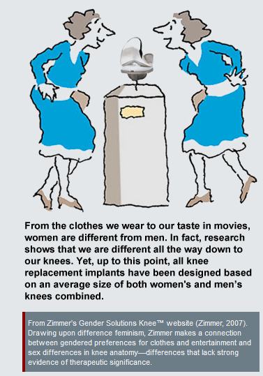 Overemphasizing sex differences is a problem, especially when companies market female-specific knees directly to surgeons and to women patients despite the lack of evidence of clinical advantages (Johnson et al., 2011). Note that Zimmer calls their knee “Gender Solutions,” implying that their product addresses not only biological but also cultural differences between women and men. Zimmer’s marketing campaign emphasizes gender as the basis of prosthesis choice. However, other factors (such as a patient’s stature, ethnicity, or a surgeon’s experience installing a particular prosthesis) have been demonstrated to be important to outcome (Sampath et al., 2009; Bellemans et al., 2010).