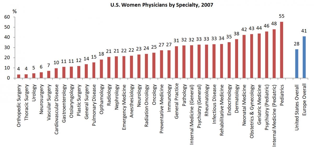 In science and engineering, women are better-represented in some disciplines than in others. In both the United States and European Union, women are better represented in life sciences (such as biology) and environmental fields (such as environmental engineering) than in physical sciences or traditional engineering fields, such as mechanical and electrical engineering. Horizontal segregation is also present in medicine. In the United States, for example, 28% of all physicians but only 6% of all neurosurgeons are female.