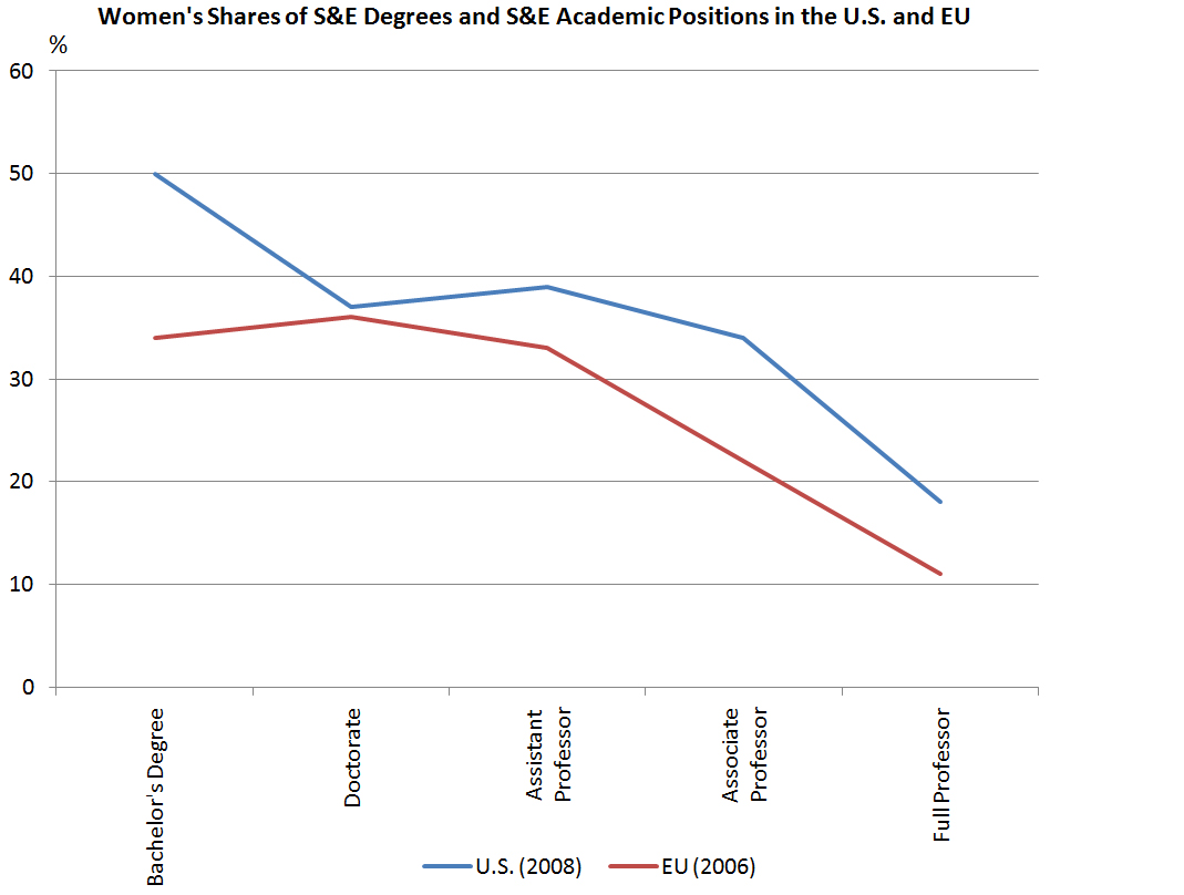 Vertical segregation describes disparities between women and men by level of seniority in a particular field. Data consistently show that women's representation declines as rank increase in both the EU and U.S. One of the many consequences of vertical segregation is that women are substantially underrepresented as academic "gatekeepers", such as grant evaluators, tenure committee members, journal editors, and members of national academies.