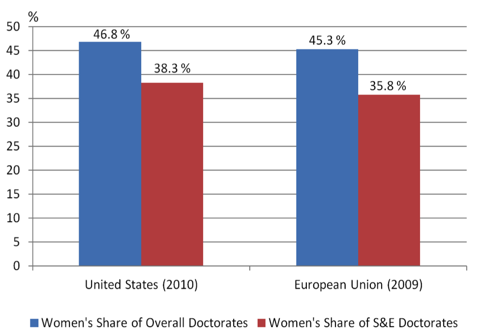 In both the United States and European Union, women are slightly underrepresented with respect to overall doctoral (Ph.D. or ISCED Level 6) degrees, but substantially underrepresented with respect to S&E doctorates: